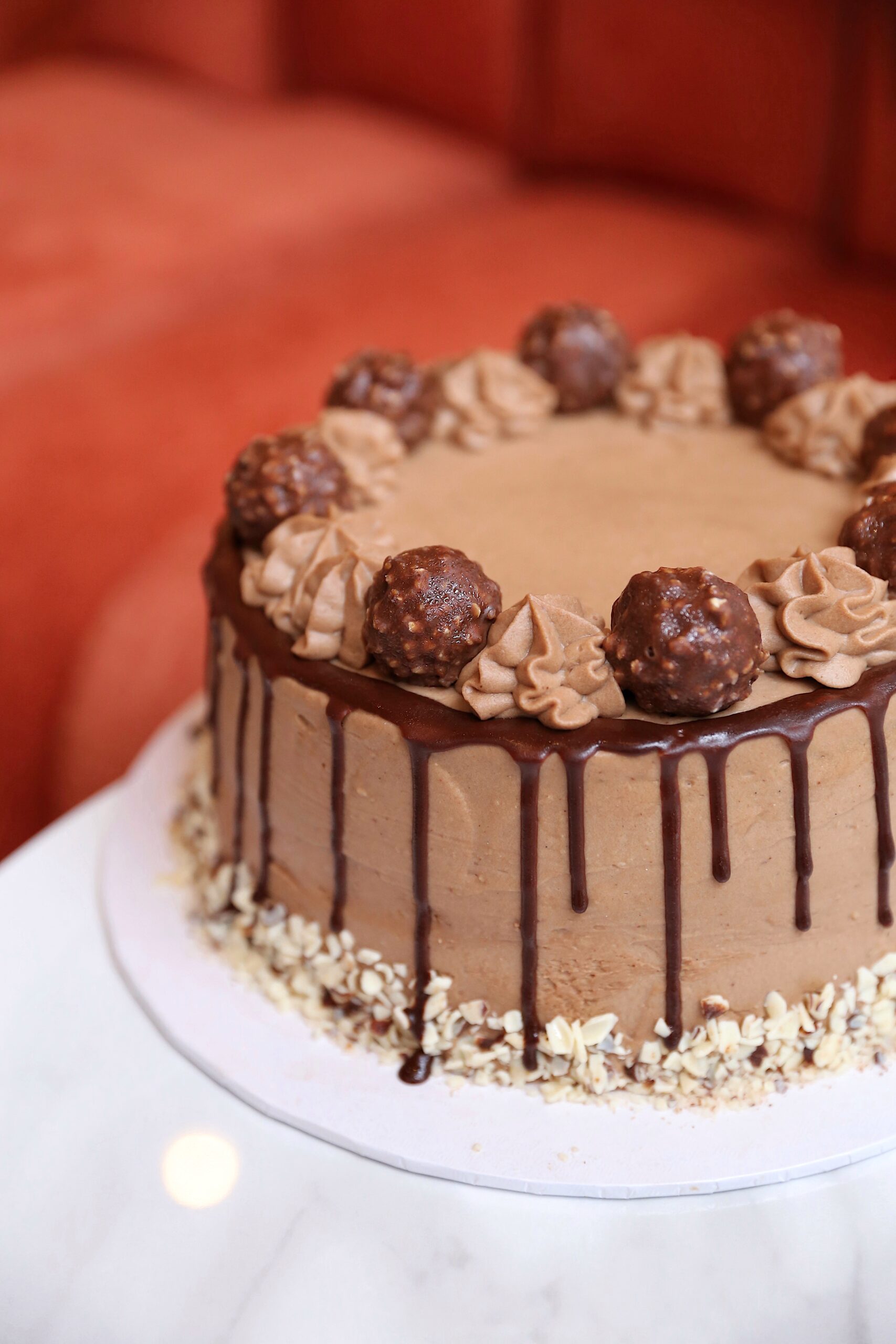 Decadent dark chocolate and coffee mud cake layered with chocolate caramel cream frosting. Adorned with Ferrero Rocher chocolates and chocolate crumble for the ultimate indulgence.